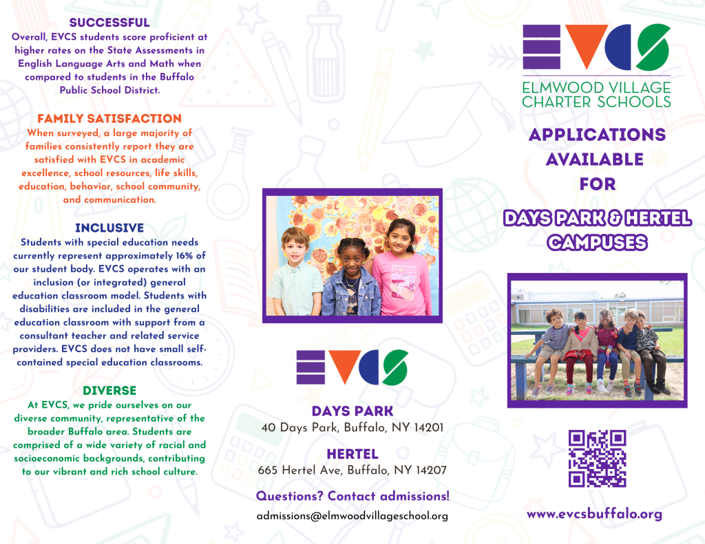 In September 2012, Elmwood Village Charter Schools moved into the historic 40 Days Park school. In September 2017, EVCS opened its second campus at 665 Hertel Avenue.